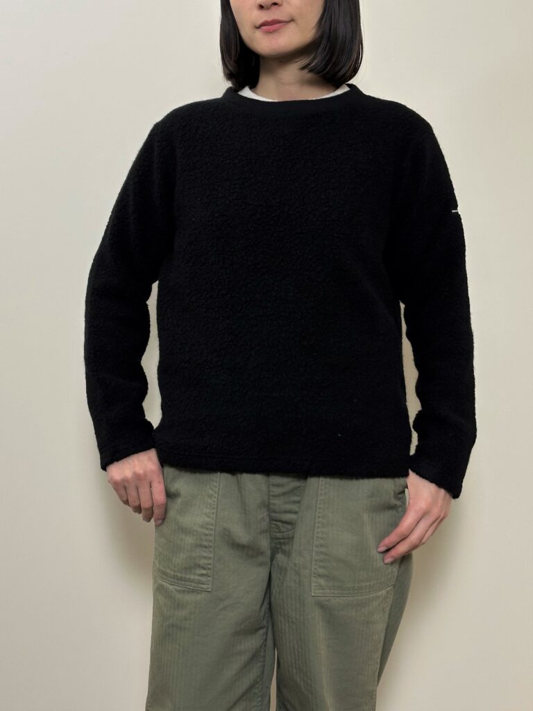 首周りが別素材で切り替えられたシンプルなクルーネックセーターの展開もあります。